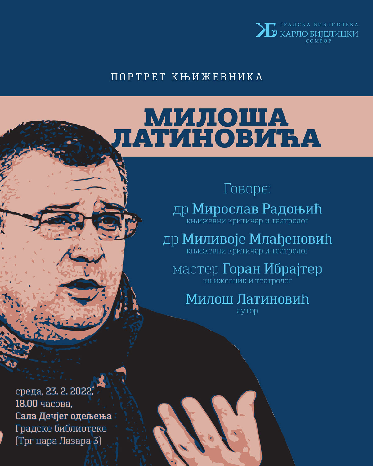 Gradska biblioteka Karlo Bijelicki priređuje veče pod nazivom Portret književnika Miloša Latinovića. U predstavlјanju portreta učestvuju dr Miroslav Radonjić, književni kritičar i teatrolog, dr Milivoje Mlađenović, književni kritičar i teatrolog, master Goran Ibrajter, književnik i teatrolog i Miloš Latinović, autor. Program je zakazan za sredu, 23. februar, u 18 časova, u Sali Dečjeg odelјenja Biblioteke.