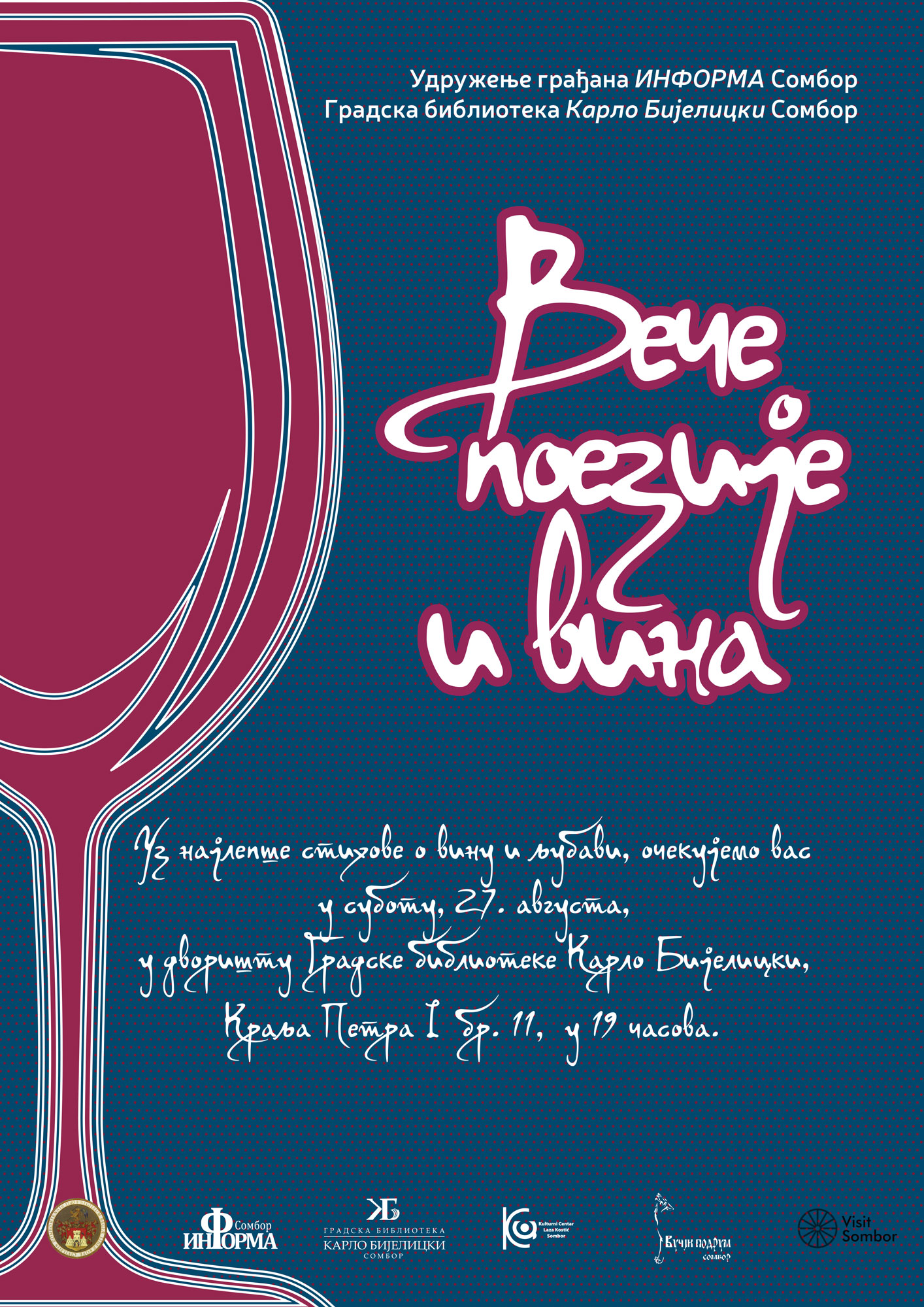 Gradska biblioteka Karlo Bijelicki i udruženje građana Informa Sombor, organizuju veče posvećeno poeziji, ali i vinu i lјubavi, kao večitoj inspiraciji pesnika. Nakon realizovanog konkursa za najlepše pesme u kojima se spominju vino i lјubav, štampana je zbirka poezije Poezija vinom obojena, u koju su ušle pesme koje su prošle selekciju žirija konkursa. Uz promociju pesama pristiglih na konkurs i dodelu nagrada, biće upriličena i promocija vina vinarije Vučji podrum.