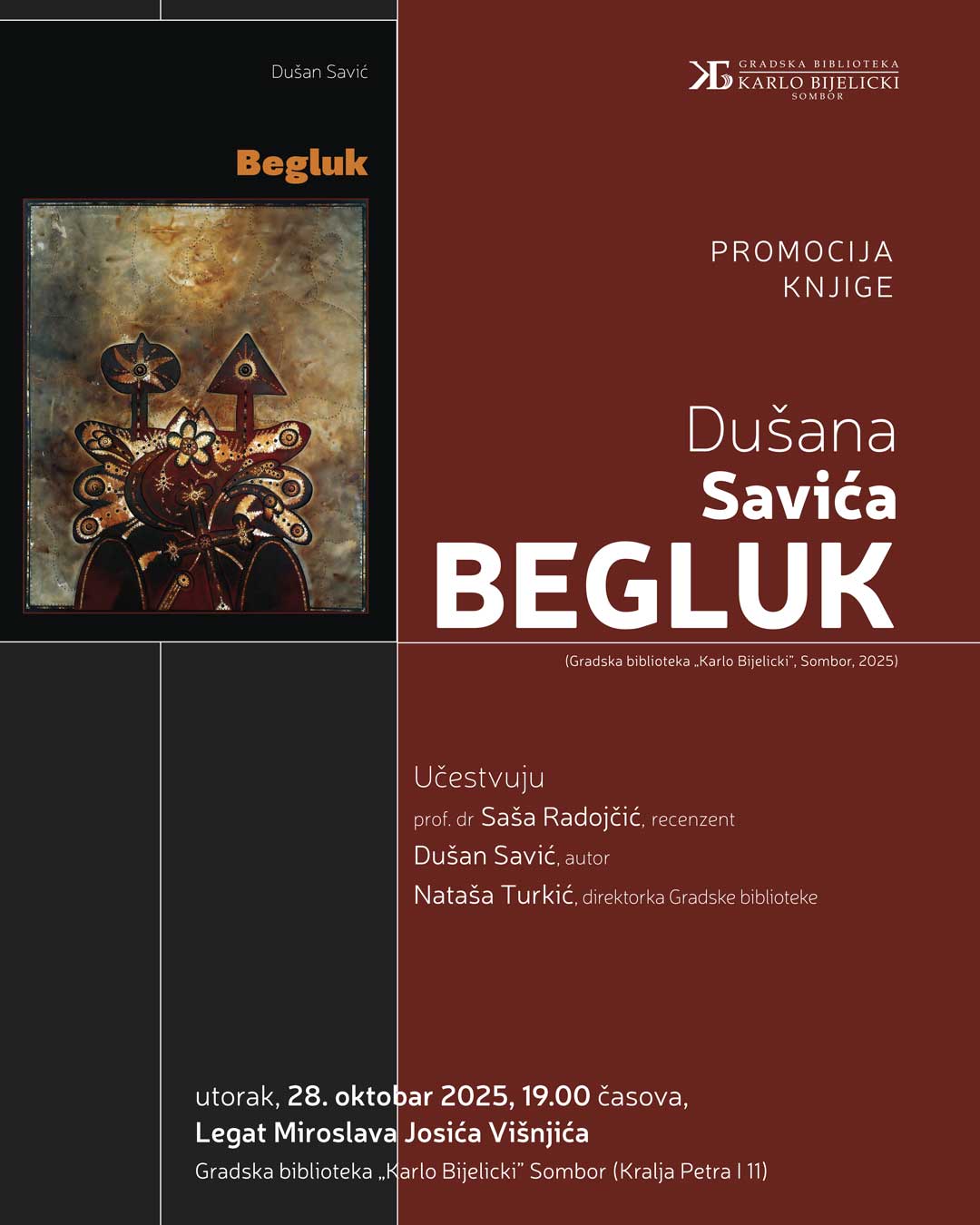 U Legatu Miroslava Josića Višnjića, u Gradskoj biblioteci „Karlo Bijelicki” u utorak, 28. oktobra, održana je promocija knjige „Begluk” autora Dušana Savića, objavljene u izdanju Gradske biblioteke „Karlo Bijelicki”.